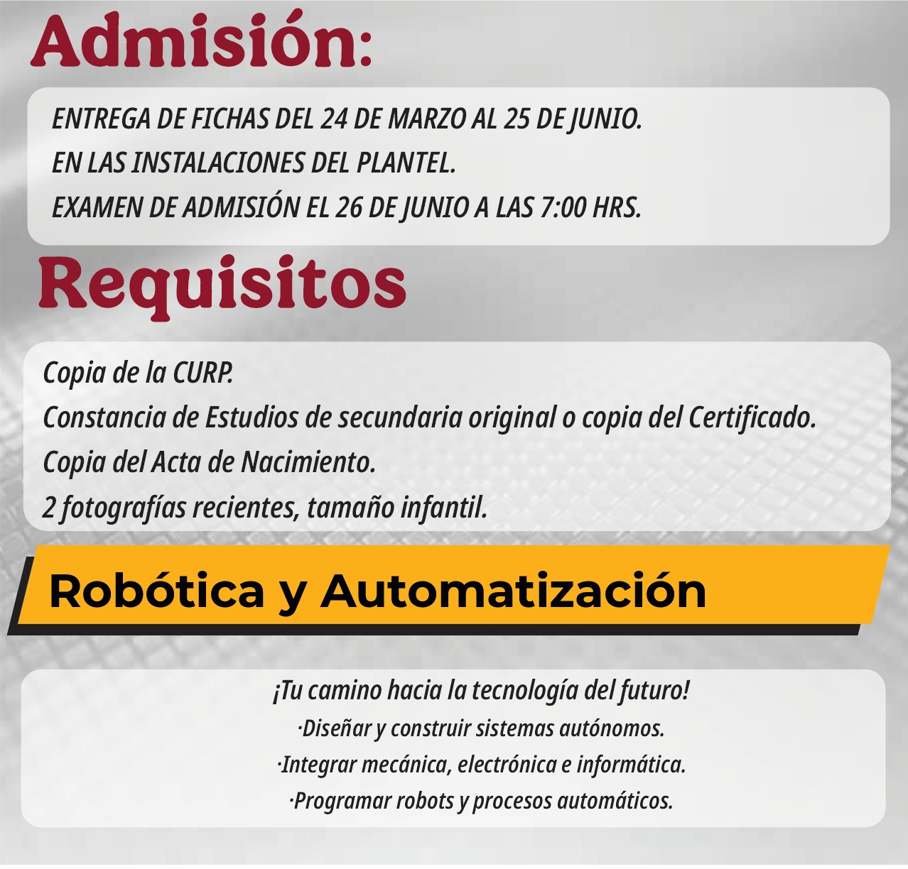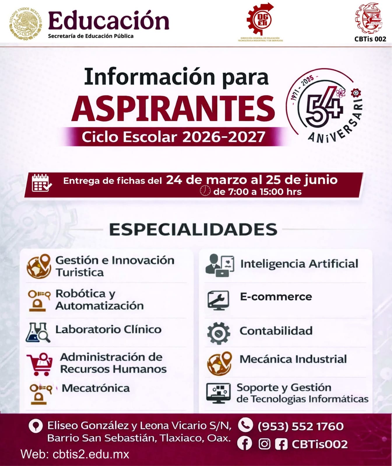 El CBTis No. 2, somos una Institución de Nivel Medio Superior perteneciente a la Dirección General de Educación Tecnológica industrial y de servicios (DGETI), con más de 53 años ofreciendo educación tecnológica bivalente (Técnico de la especialidad y como bachiller) a los jóvenes de la mixteca. Contamos con 9 especialidades: Administración de Recursos Humanos, Contabilidad, Mecatrónica, Mecánica Industrial, Laboratorista Clínico, Logística y Soporte, Comercio Electrónico, Inteligencia Artificial y Mantenimiento a Equipo de Cómputo.